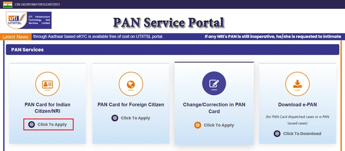 - Step 2: Under PAN Services – Click on “PAN Card for Indian Citizen/NRI.”