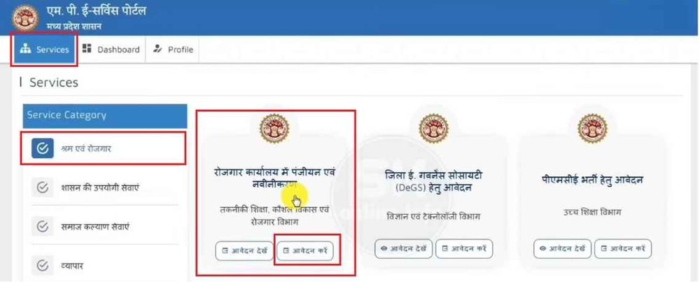 - Step 4: Choose Renewal Option: Look for “रोजगार कार्यालय में पंजीयन नवीनीकरण” (Employment Office Registration Renewal). Click on “आवेदन करें” (Apply Now) next to this option.