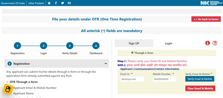 - Step 4: Verify Email & Mobile Number: Enter OTP you received on your email ID & Mobile Number and Click to “Verify” Button.